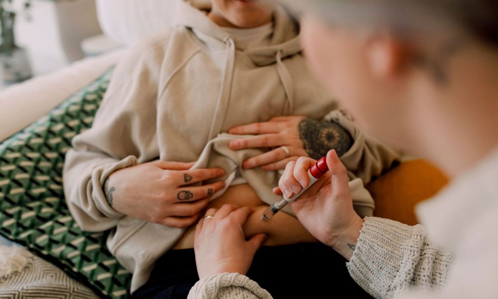 A couple uses a needle to inject the others stomach as part of an IVF treatment.